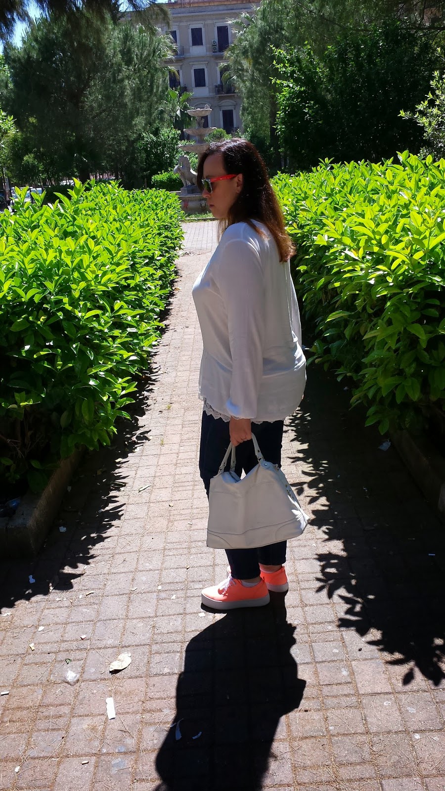 Tante new in in questi scatti a partire dalle sneakers fluo con la zeppa, la blusa col bordo in pizzo acquistata da Oltre e la splendida collana sui toni del corallo che mi ha inviato il sito Sammydress.com